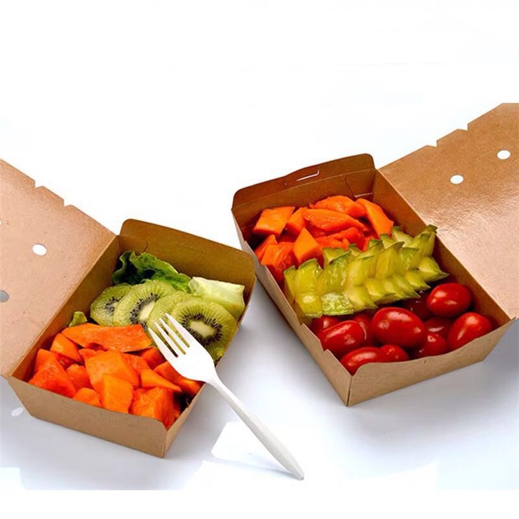 Die Kraftpapier-Lebensmittelbox mit Löchern von Shenglin Packaging ist innen mit einer Beschichtung versehen, die ein Auslaufen und Fett verhindern kann. Das Design der oberen Belüftungslöcher der Kraftpapier-Lebensmittelbox mit Löchern von Shenglin Packaging sorgt dafür, dass die Lebensmittel atmungsaktiv bleiben und verhindert, dass die frittierten Lebensmittel weich werden. Die Kraftpapier-Lebensmittelbox mit Löchern von Shenglin Packaging kann Lunchboxen aus Kunststoff und Styropor ersetzen. Die Kraftpapier-Lebensmittelbox mit Löchern ist eine ideale Ergänzung für geschäftige Haushalte, schnelle Lebensmittellieferungen und gekochte Mahlzeiten und versorgt eine große Anzahl von Menschen, ohne dass eine Spülmaschine erforderlich ist.